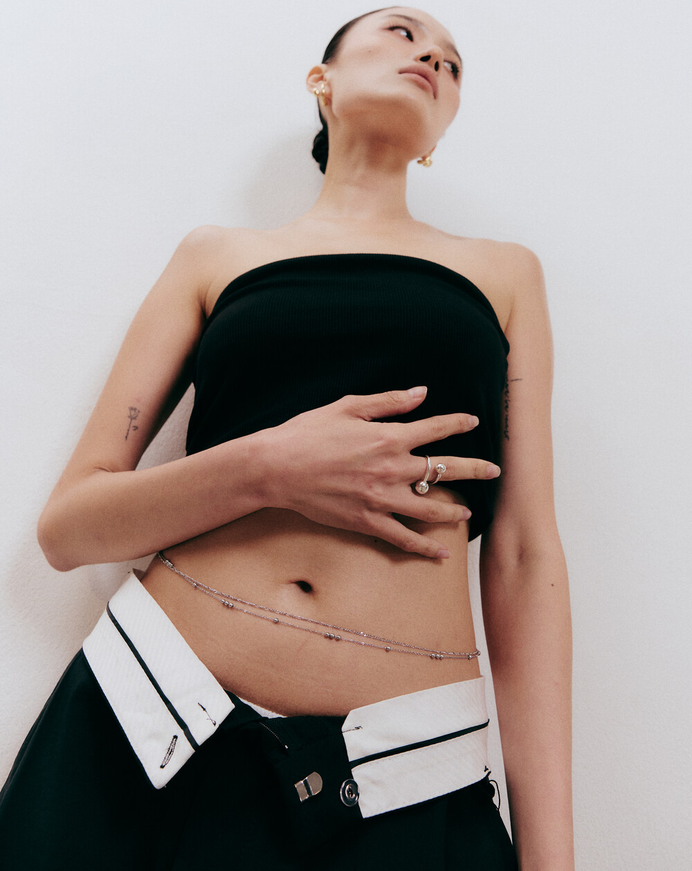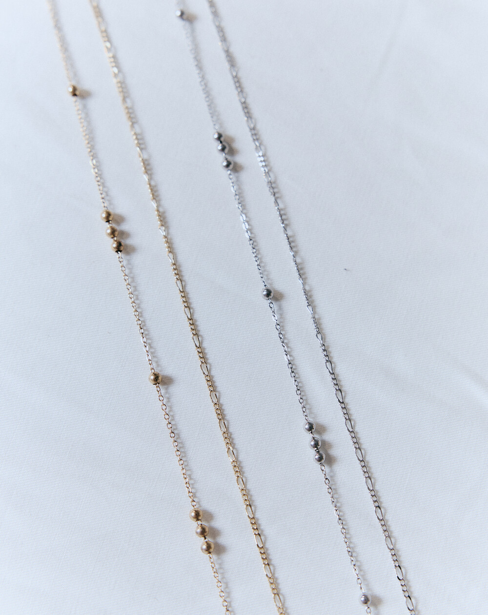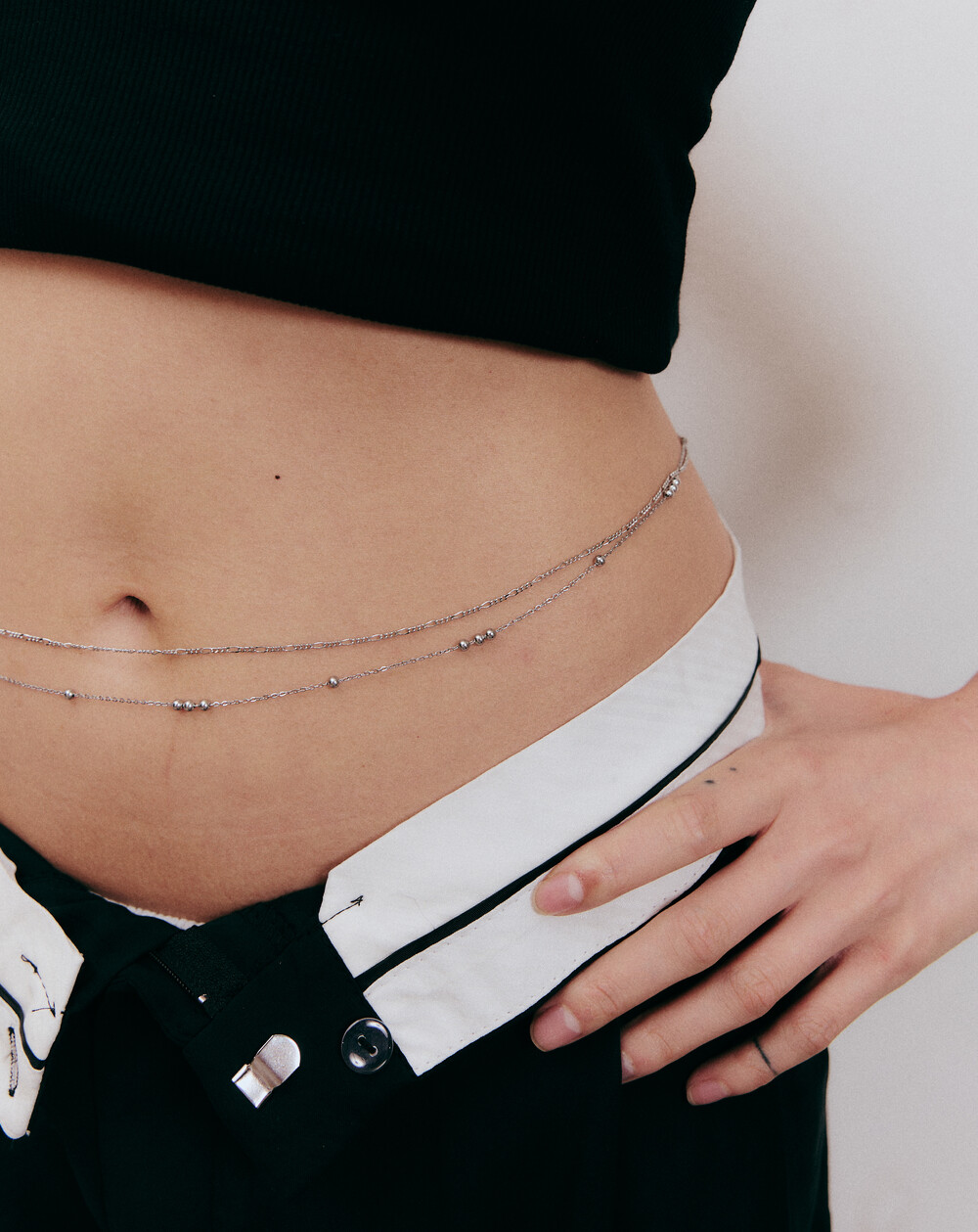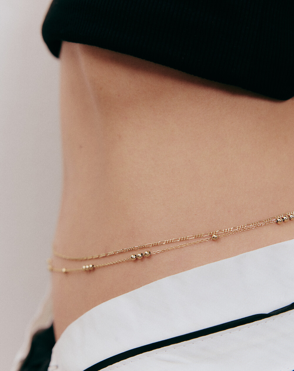두 가지 체인이 함께 어우러진 벨리 체인으로, 각각 다른 디자인의 얇은 체인이 조화를 이루며 룩에 세련된 포인트를 더해줍니다. 섬세한 디테일이 돋보이며, 스타일에 화려함과 고급스러움을 더해주는 아이템입니다.
